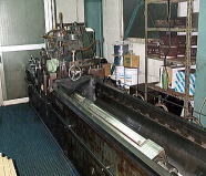 被研削物が1mに付き精度2/100mm以内の真直度を保ち、2800mmまで研磨可能な平面研削盤。スライド・フレームは油圧モーター駆動によりベット上を左右に移動しながら長尺刃物を研削仕上げし必要に応じてラッピング加工し刃先に鋭利な刃付けをします。